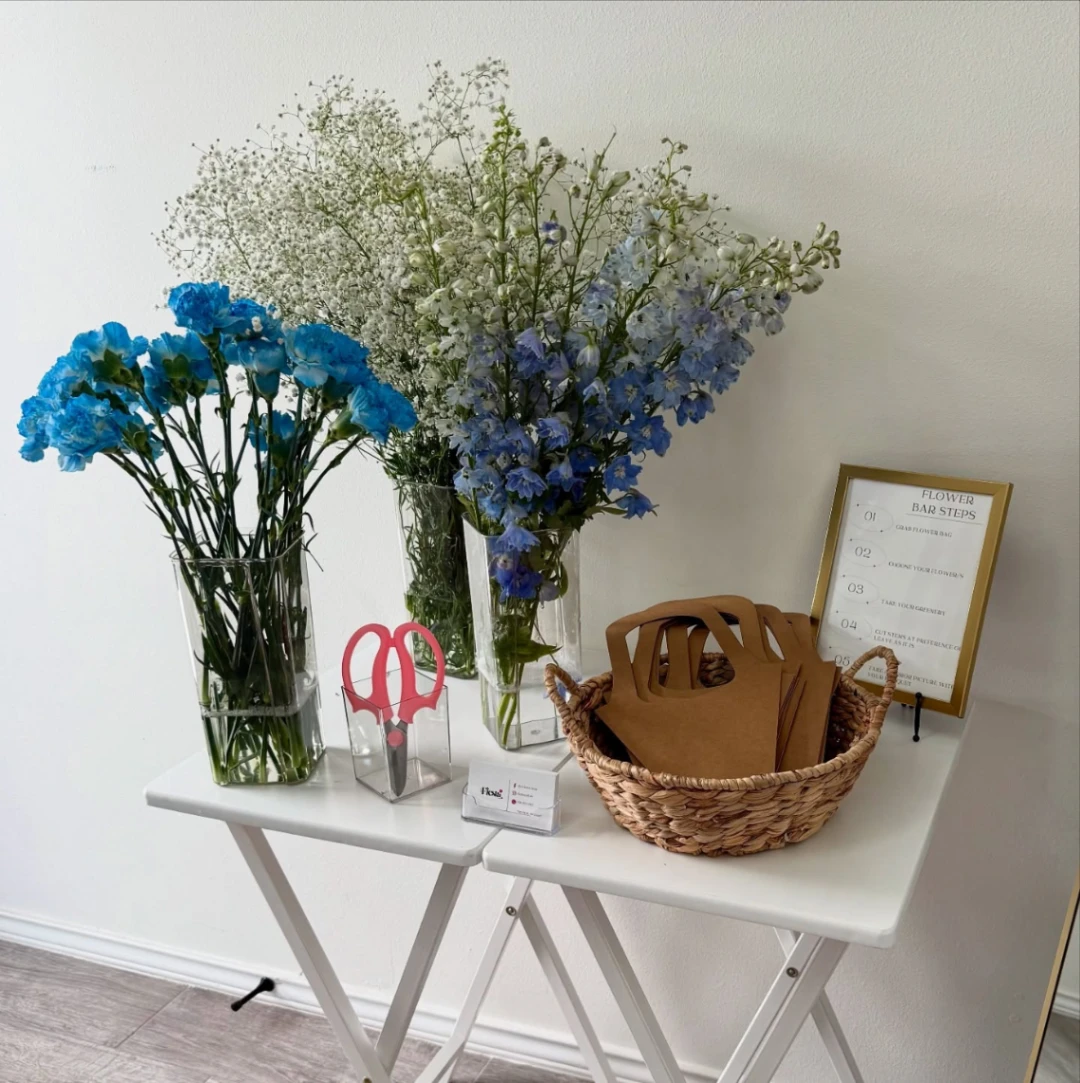 Flower bar rental for your events, your guests can experience a fun DIY and design unique bouquet of flowers with a color scheme that matches your theme and a personal touch by adding tags or stickers.